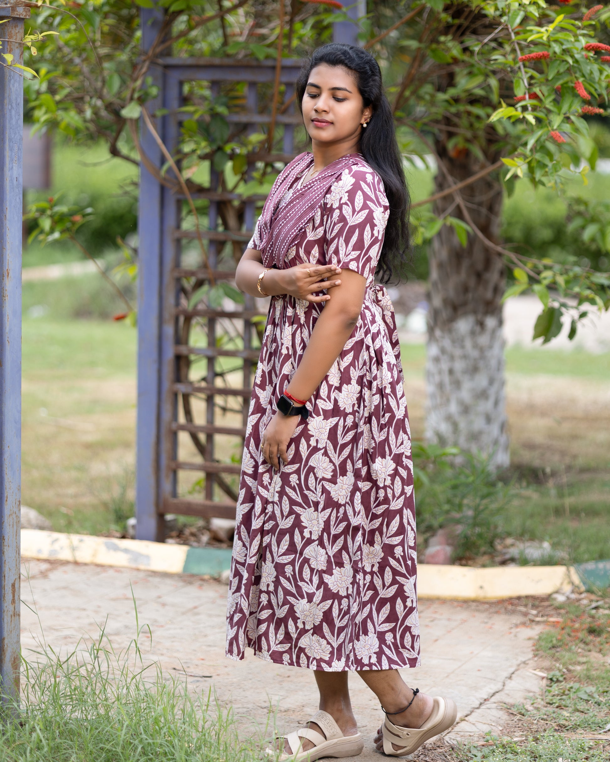 Feeding Dupatta Attached Zipper Maternity Wear – Brown with Cream Floral