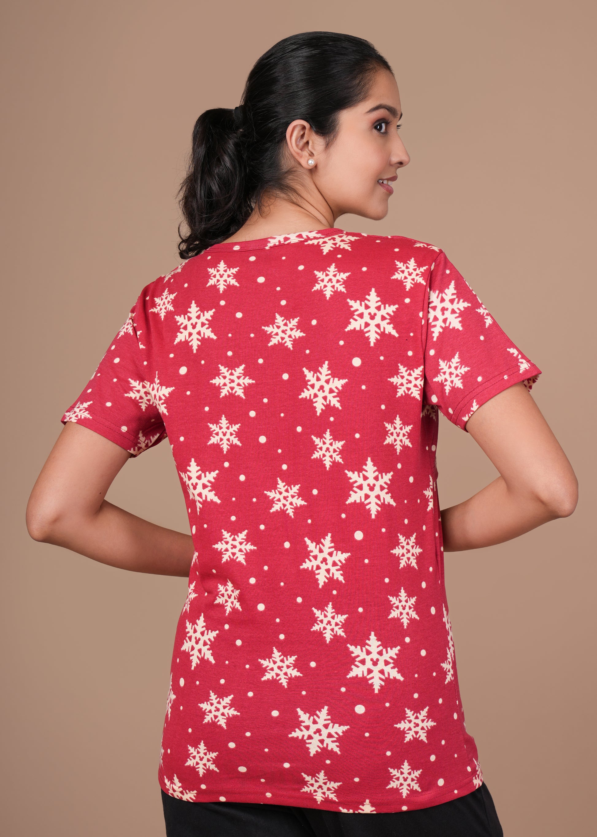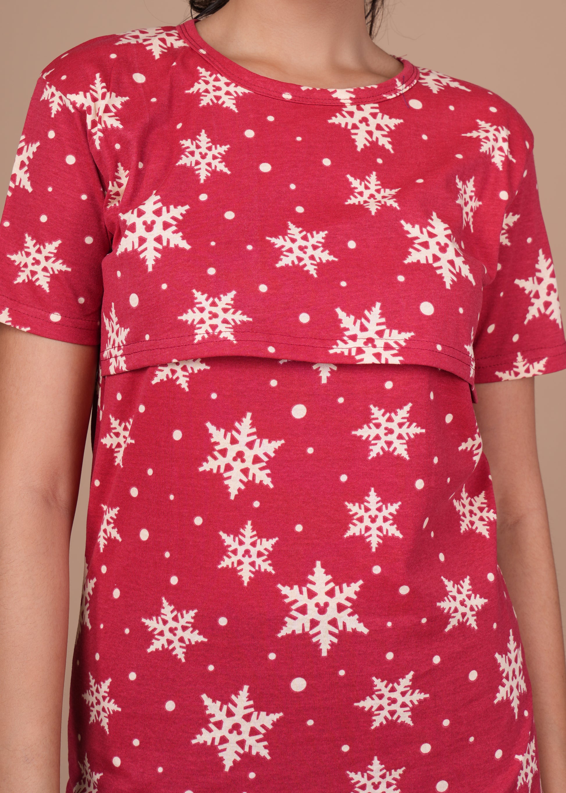 Women’s Zipless Feeding Top-Red with White Snowflake Print