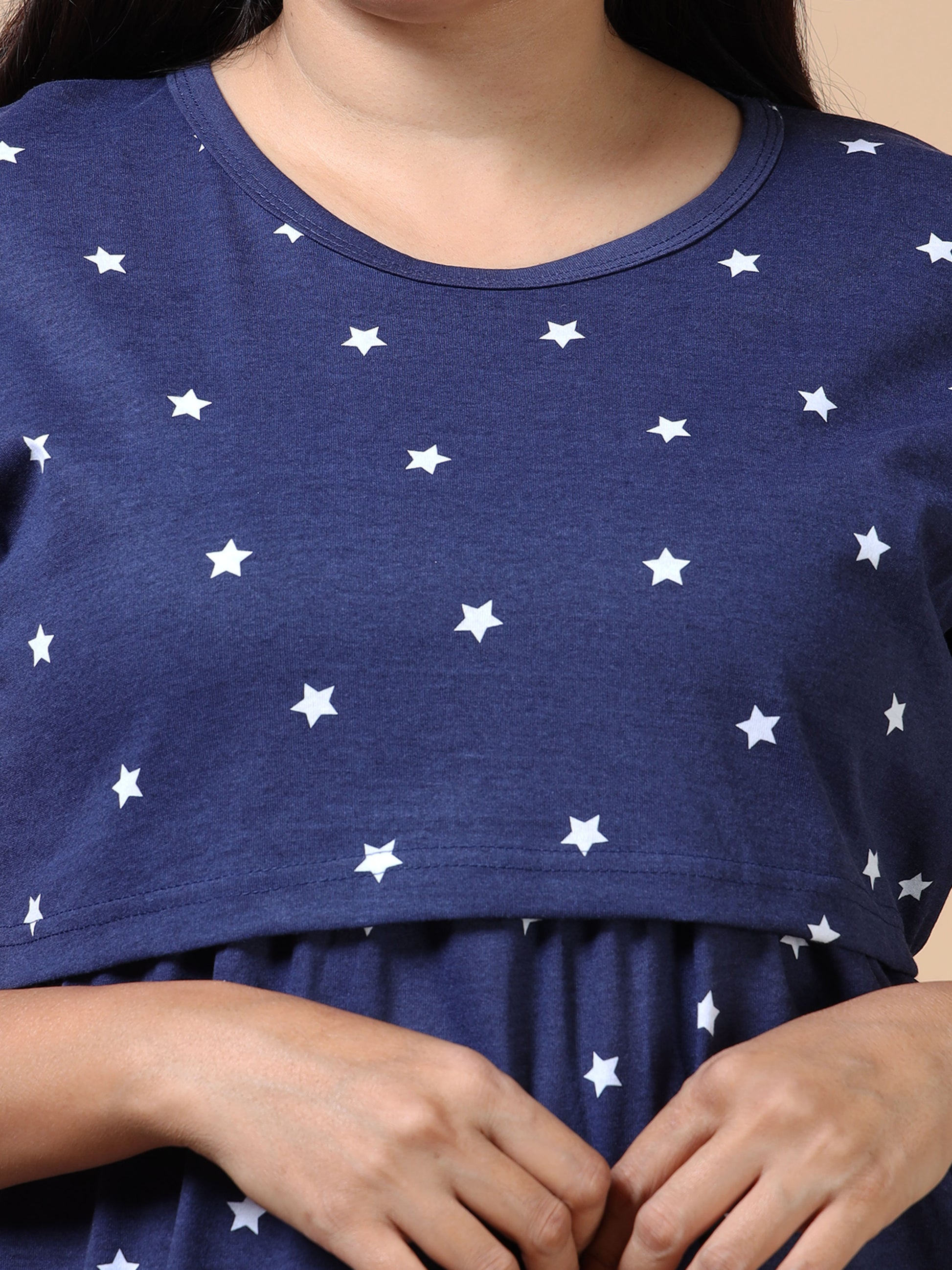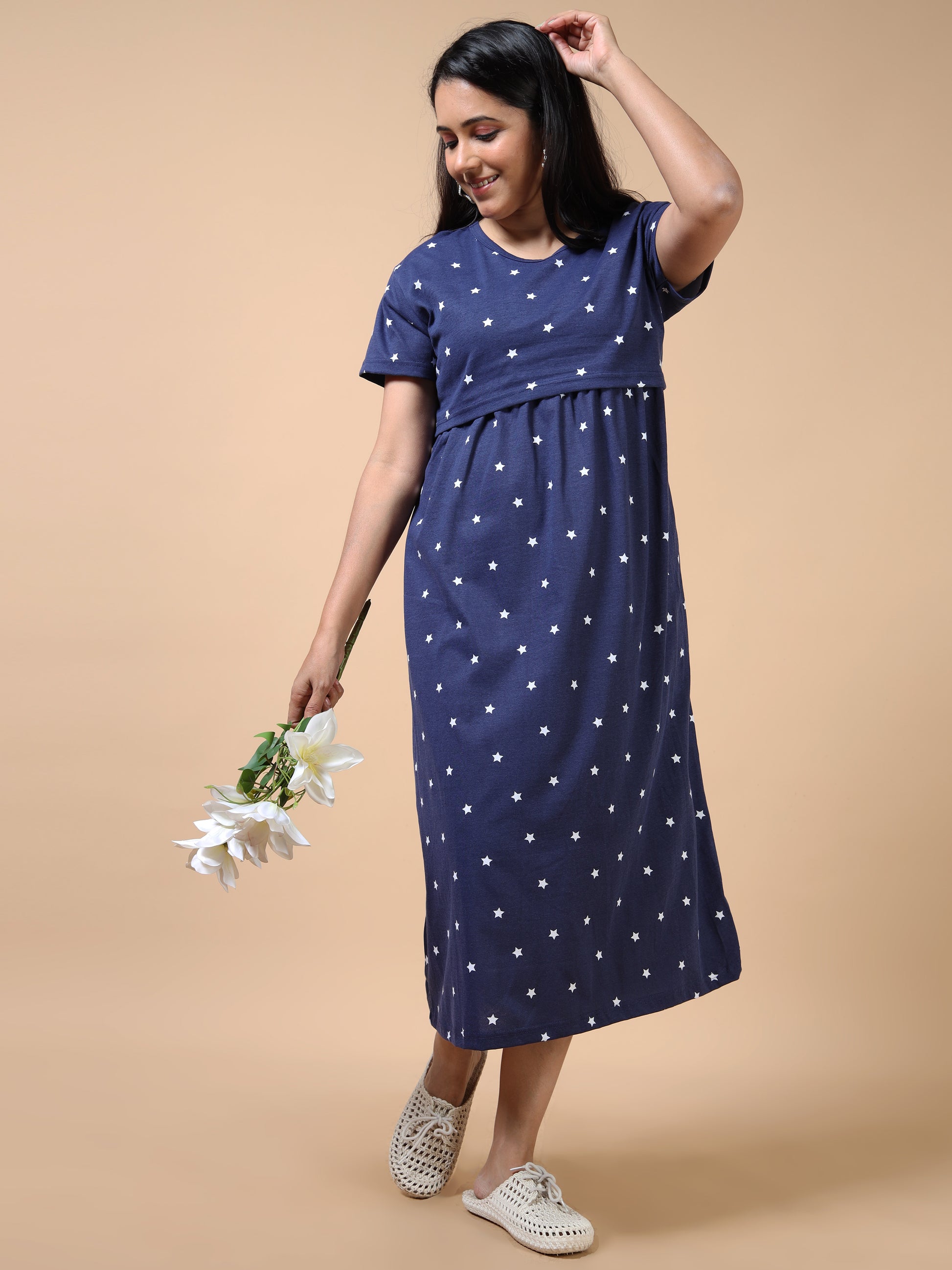 Zipless Feeding Maternity Dress –Navy Blue with White Star Print