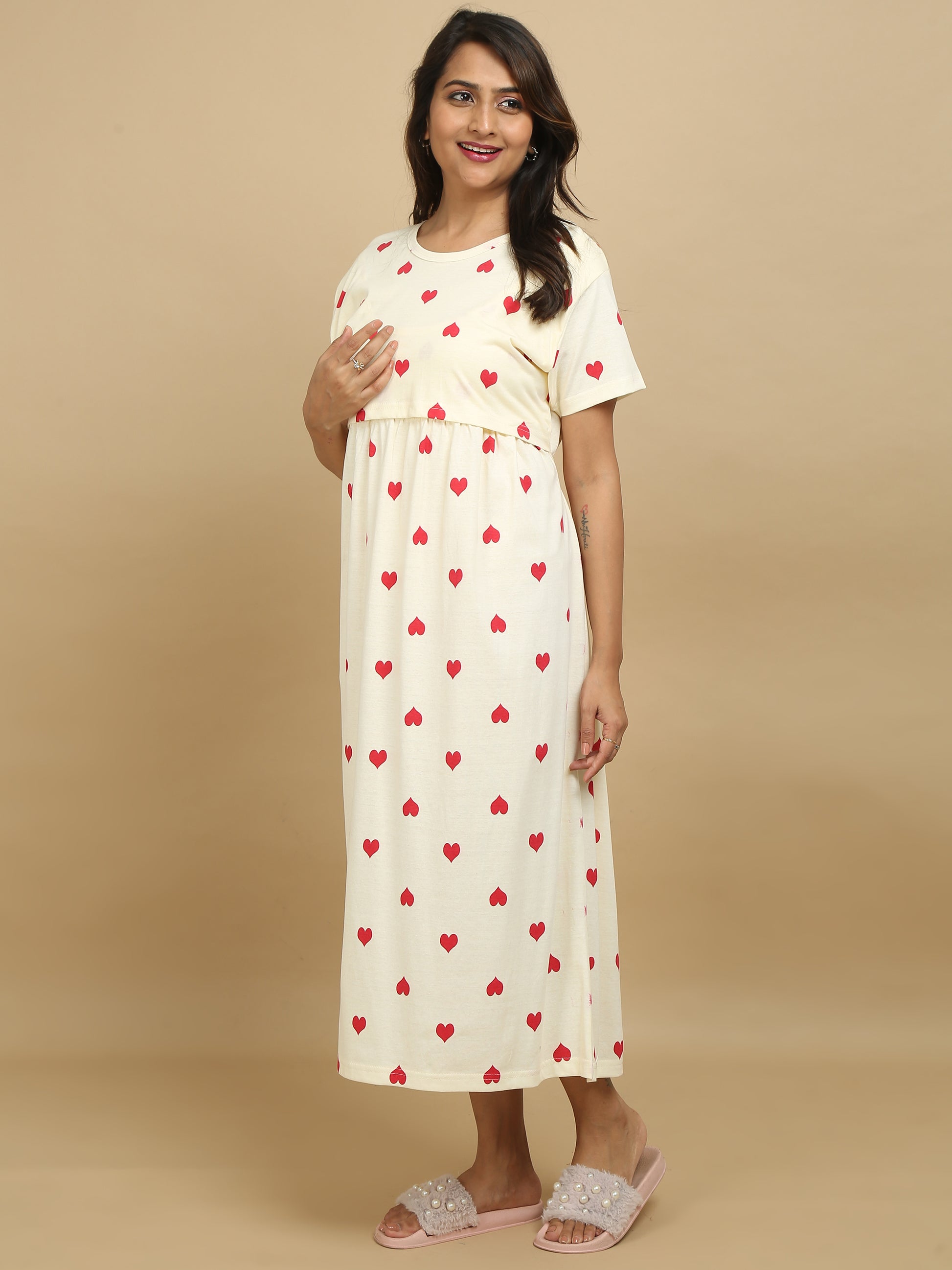 Zipless Feeding Maternity Dress –Cream with Red Hearts